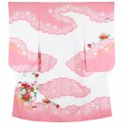 疋田雲取りのプリント柄に豪華な刺繍の入った着物と金襴生地の小物に着付け小物が付いたセットです。